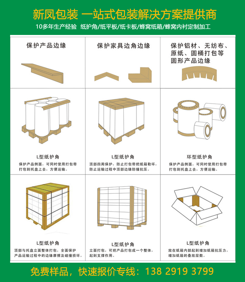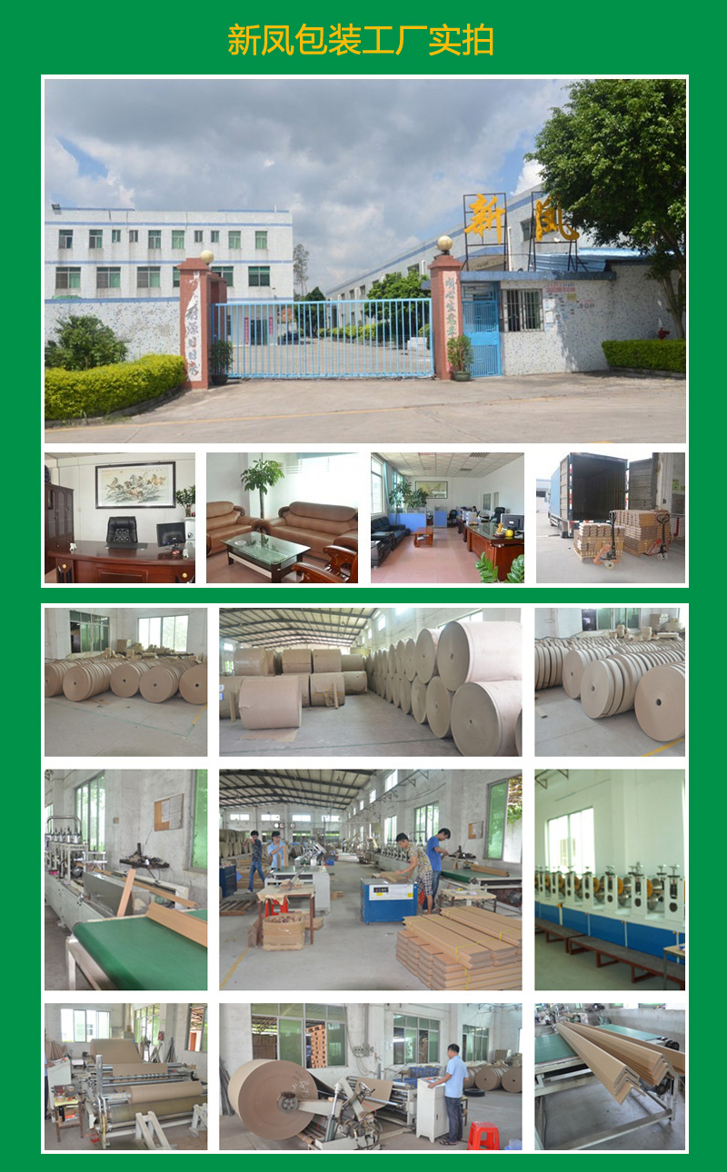 新鳳包裝生產(chǎn)的紙護角由100%可回收材料制成,應(yīng)用廣泛,可用于保護(門、窗、桌面、面板、管道、型材等各種產(chǎn)品),是一種安全綠色的包裝材料。