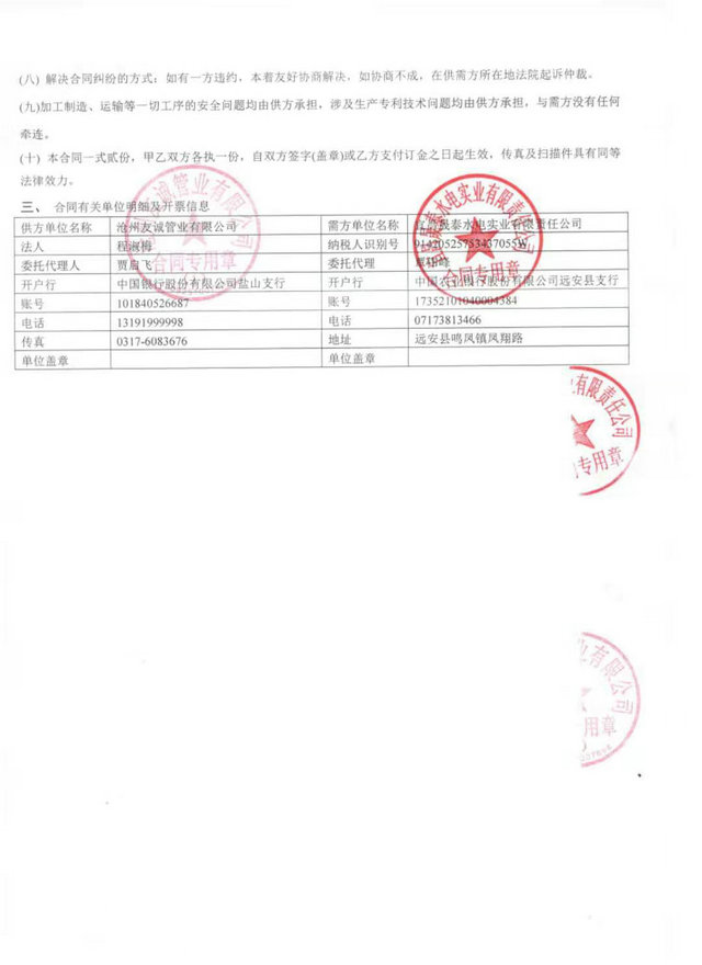 2019年10月23日友誠管業(yè)有限公司于宜昌市晟泰水電實業(yè)有限責(zé)任公司簽署了柔性承插口連接涂塑鋼管,從開始于譚總交談到來廠里考察,譚總對我們非常的信任認可,我們一如既往的做好每一個業(yè)務(wù)